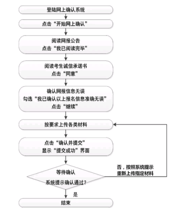 考生在规定时间内,进入登陆页面后,输入学信网账号、密码,核对本人的网报信息、按要求上传相关材料照片后等待考点审核结果,网上审核通过的考生视为报名成功。在审核期内,网上审核未通过的考生请根据提示及时重新提交相关材料并等待审核,审核通过后视为报名成功。逾期不再办理确认手续。建议考生不要在确认的最后一天提交审核材料,以免因审核不通过没有足够的时间准备补充材料而错过网上确认。