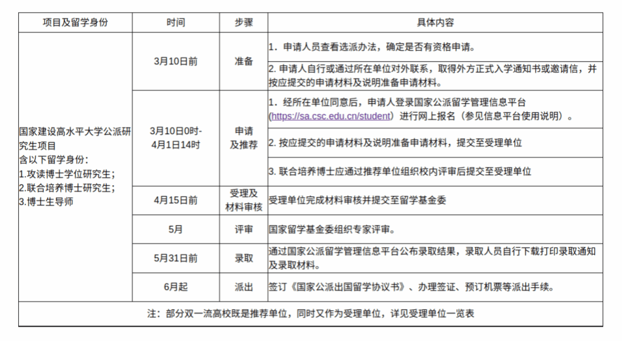 (一)申请人及时登录国家留学基金委网站,查看“2026年国家建设高水平大学公派研究生项目专栏”,了解选派计划、选派类别、基本申报条件、申请时间以及外语合格条件等相关信息。
