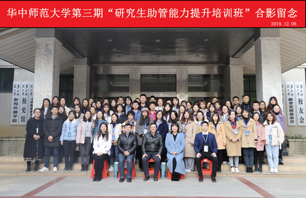 (通讯员 麦沛玲 王雨)为进一步加强和改进新时代我校研究生思想政治工作,提升我校研究生助管的全面能力,结合我校研究生助管的实际情况建立有效的培训体系,由华中师范大学研究生院(党委研究生工作部)主办,华中师范大学政治与国际关系学院承办的“华中师范大学第三期研究生助管能力提升培训班”于2019年12月6日至8日成功举办。共有来自全校26个学院,42个设岗单位的73名助管参加此次培训。