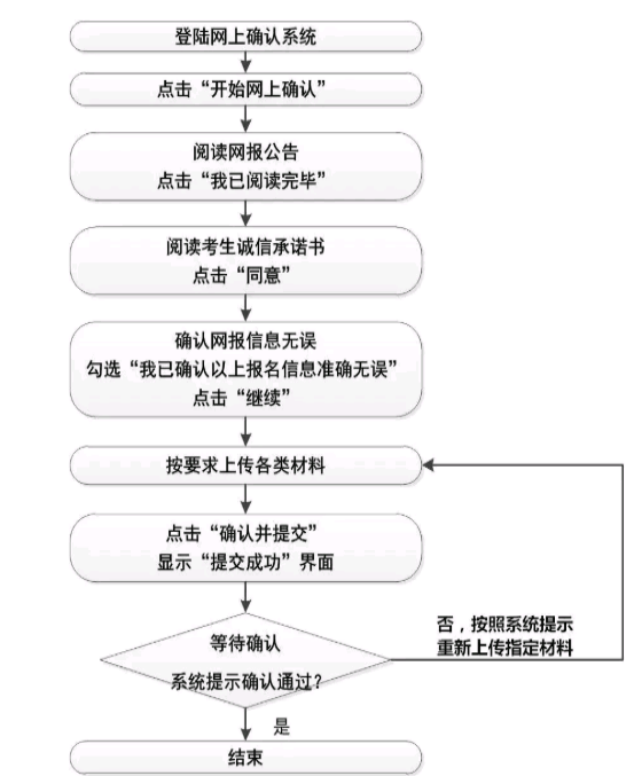 考生在规定时间内,进入登录页面后,输入学信网账号、密码,核对本人的网报信息、按要求上传相关材料照片后等待考点审核结果,网上审核通过的考生视为报名成功。在审核期内,网上审核未通过的考生请根据提示及时重新提交相关材料并等待审核,审核通过后视为报名成功。逾期不再办理确认手续。建议考生不要在确认的最后一天提交审核材料,以免因审核不通过没有足够的时间准备补充材料而错过网上确认。