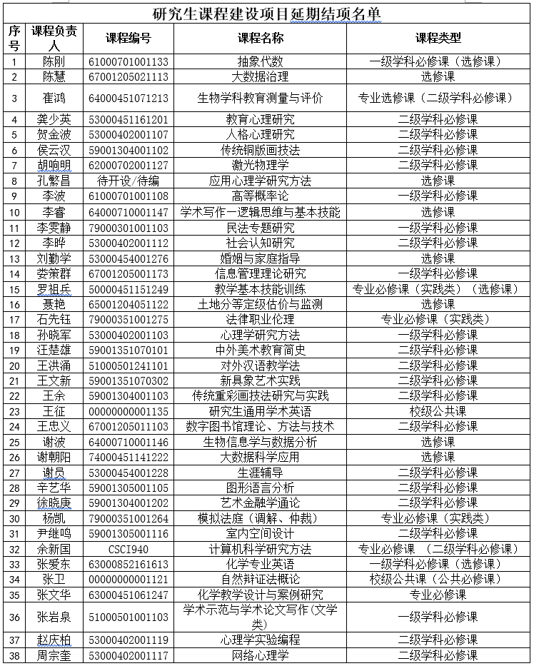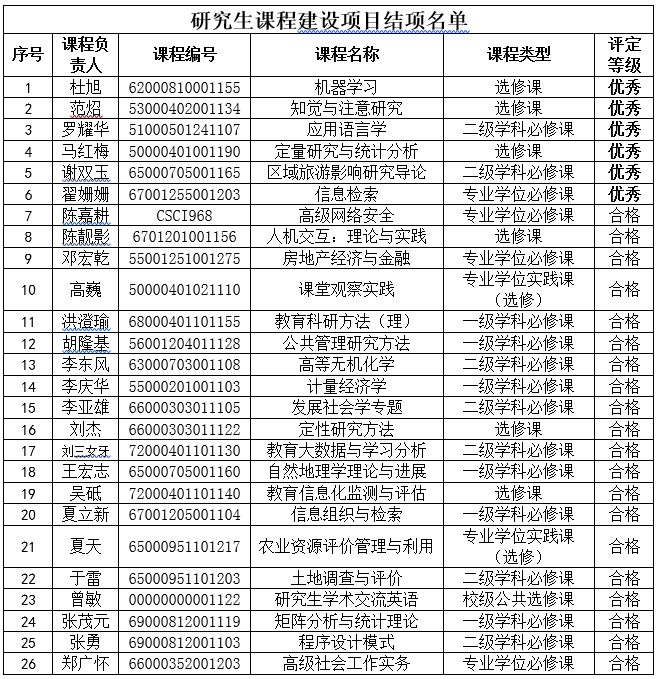 根据《华中师范大学研究生课程建设规划》的有关要求,研究生院对立项建设的64门研究生课程组织开展了第一轮结项评审工作,《高级网络安全》等26门课程验收合格,其中《机器学习》等6门课程验收优秀, 另有38门课程申请延期结项。现将评审结果公布如下: