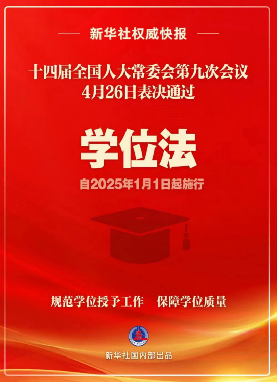 2024年4月26日,第十四届全国人民代表大会常务委员会第九次会议表决通过《中华人民共和国学位法》,自2025年1月1日起施行。贯彻落实学位法,是在法治轨道上推进学位工作高质量发展的重要基础,也是促进教育治理体系和治理能力现代化的有力支撑。我校将于2024年年底前调整配套校内的相关规章制度,确保明年的毕业季(2025上半年)平稳落地实施;并结合自身优势开展学位法相关的调研和重大现实问题研究。