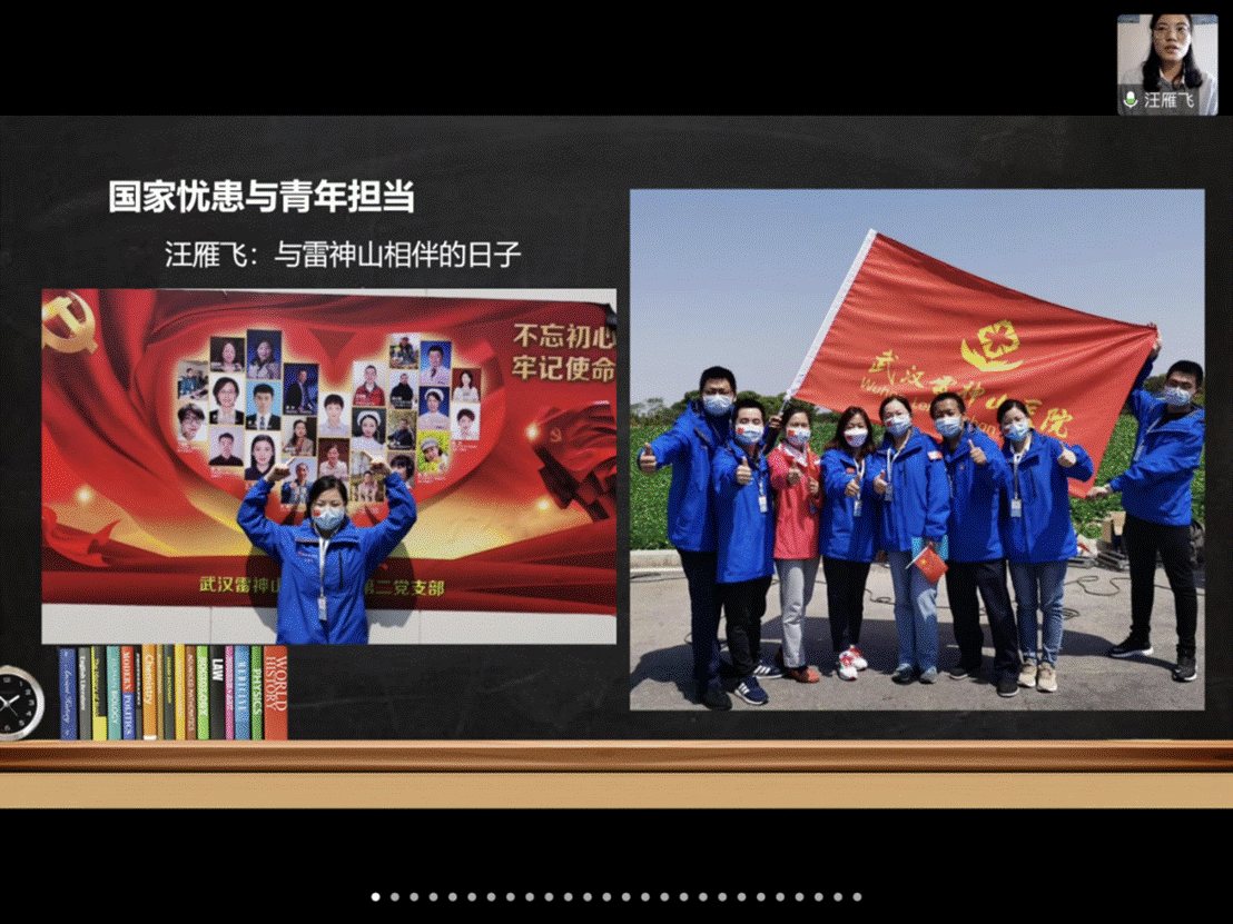 在“忧患何解”部分。主讲人通过引入的汪雁飞和刘洁两名校友的抗疫故事,展示了青年人在疫情面前的使命担当。汪雁飞受邀来到线上课堂,向同学们分享了她在雷神山工作的经历与感受,她深情的讲述极大感染了在场师生,大家纷纷发送“学姐好样的!”“为华师学子点赞!”等文字,表达对汪雁飞的赞扬与钦佩。主讲人勉励同学们,虽然大家并非医护工作者,也不能亲上一线,但“诚与国分形同气,忧患共之者也”,也可以力所能及地发挥自己的力量。