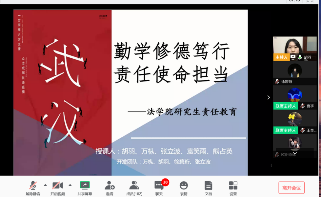 在“彰显责任担当”部分,主讲人从遵守校规、科研智慧、担当奉献与家庭栋梁四个角度为切入点,引导研究生用实际行动彰显责任担当。法学院2019级熊占英同学分享作为“一对一”帮扶武汉一线医护人员子女志愿者的经历和感想。让她对“民族大义、无私奉献、坚守岗位”的精神品质有了更多的思考,也更懂得了在国家危难之时,该如何践行青年学子的责任担当。