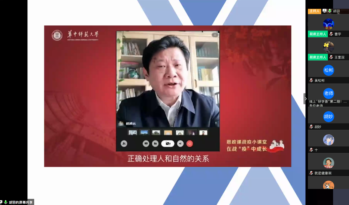 3月29号晚6点整,由研究生院(党委研工部)主办、法学院研究生政工团队承建的研究生“线上点名”主题教育示范课暨线上“研学荟”继续开讲。主讲人为法学院研究生辅导员胡羽。校党委书记赵凌云、副校长彭双阶,研究生院(党委研工部)负责人、各培养单位思政工作负责人、研究生辅导员以及法学院相关领导等到堂观摩。