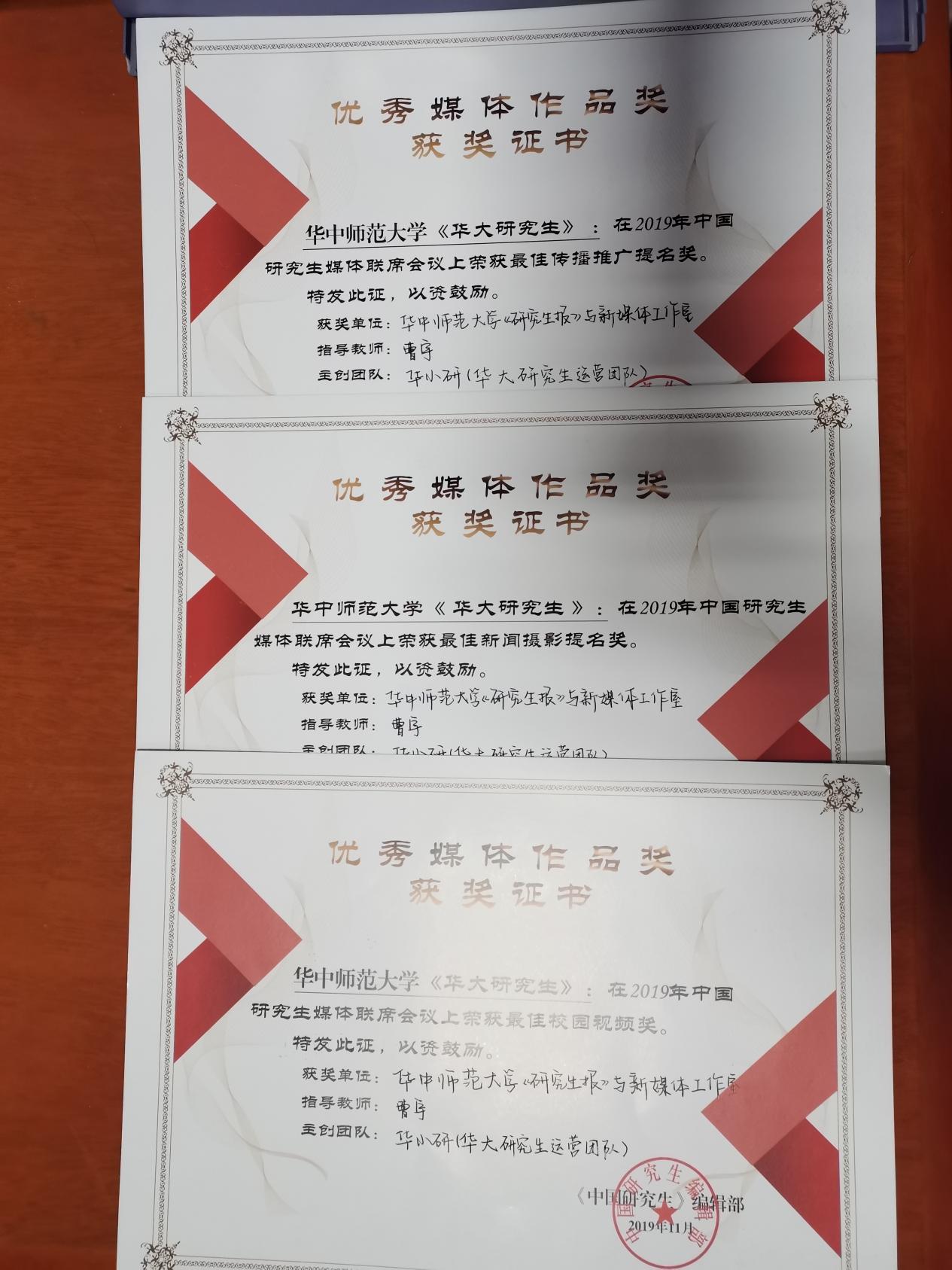 我校研究生院(研工部)事务办教师曹宇带领《研究生报》与研究生新媒体工作室执行主编袁婉婉、华中师范大学研究生学报执行主编徐文梦参与了此次会议。我校研究生官方媒体平台“华大研究生”在此次联席会议上表现不凡,从500余件参展作品、130多所参赛高校中脱颖而出,荣获“优秀媒体建设奖”、“最佳校园视频奖”、“我是中国研究生,我为祖国点赞”主题活动“优秀组织单位”、“最佳新闻摄影提名奖”、“最佳传播推广提名奖”等五大奖项。