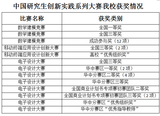 此次大赛由我校研究生院负责统筹主办、依托并联合有关研究生培养单位(物理科学与技术学院、计算机学院、数学与统计学学院、国家数字化学习工程技术研究中心)协助承办,经过研究生院的通力支持与多方协调、承办单位的精心组织和积极培育、专家全程悉心指导、参赛研究生的勇于拼搏和激烈角逐,我校最终荣获包括全国一等奖1项,三等奖4项,“成功参与奖”12项,“全国商业计划书专项赛初赛团队”二等奖1项,“全国商业计划书专项赛初赛团队”三等奖2项;华中地区分赛区一等奖2项,二等奖4项,三等奖1项;物理科学与技术学院刘守印教授和黄光明教授荣获“华中分赛区优秀指导教师”称号。同时,由于我校在组织国家决赛过程中表现突出,学校被授予2018年“中国研究生创新实践系列大赛优秀组织单位”,据悉,湖北省仅有三所高校获此荣誉(其他两所高校分别是是武汉大学和武汉理工大学),全国也仅有24所高校获此殊荣。