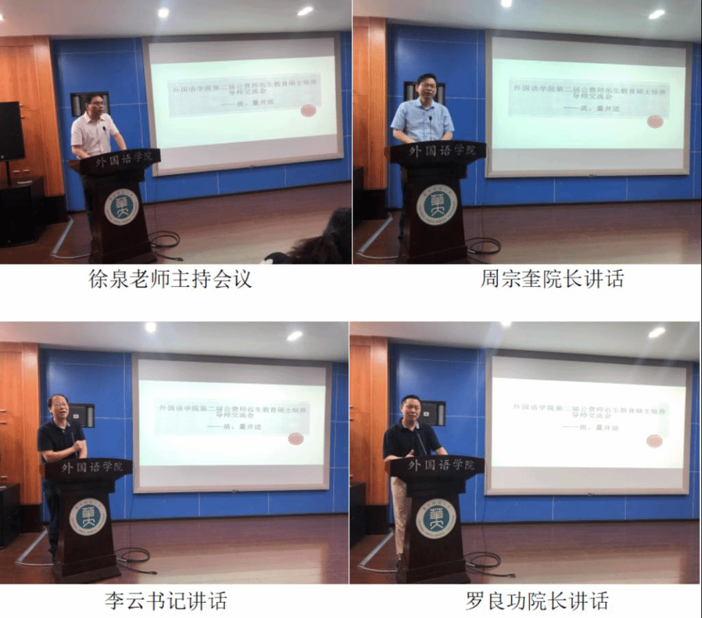 会议开始,首先由徐泉老师介绍了本次会议的背景。继2019年外国语学院举办了首届公费师范生教育硕士培养导师交流会以来,我院的公费师范生教育硕士的培养在课程建设、管理规范、培养过程、论文质量和导师指导投入方面都有显著的提高。但是,新形势下也逐渐暴露出毕业率和论文预审通过率方面的新问题。本次会议既是总结成绩和经验,更是要探讨这些新问题的解决思路。