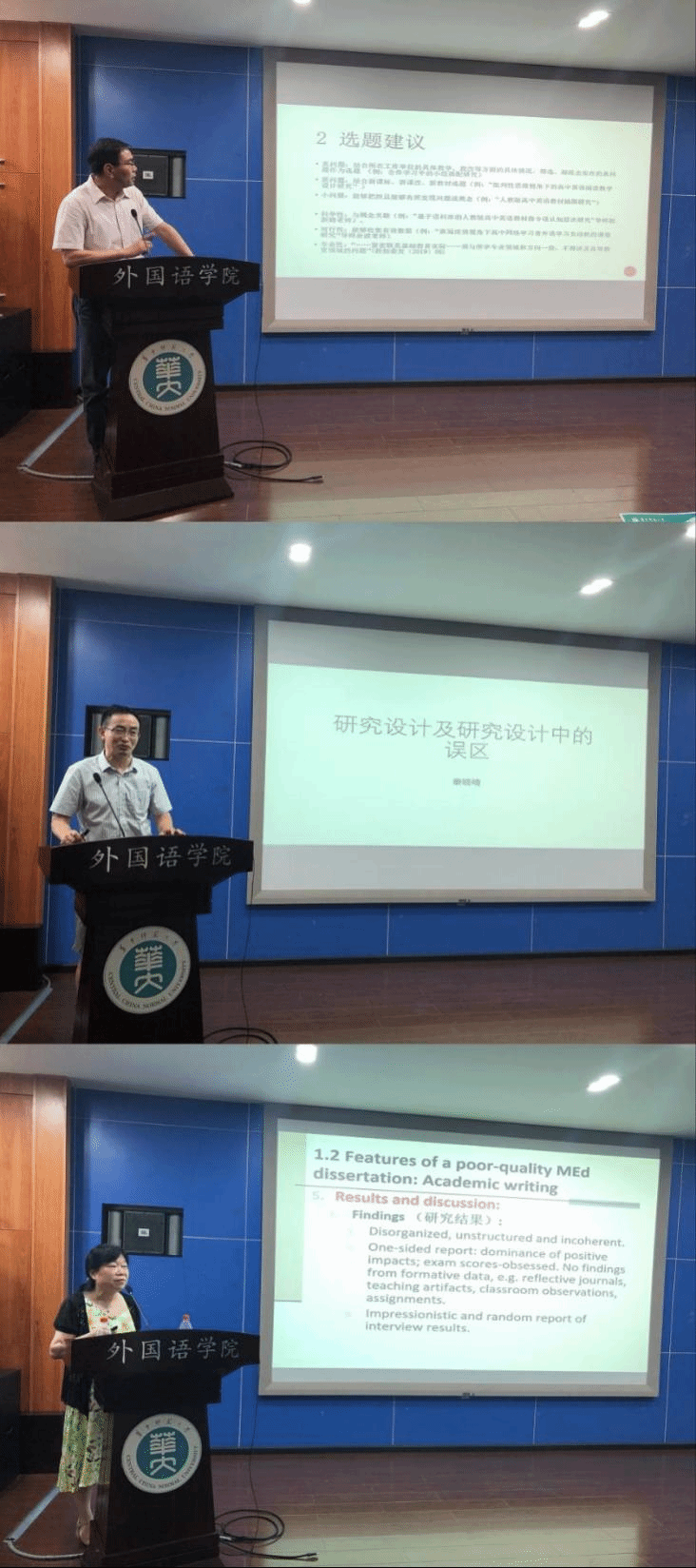 随后,徐泉老师,秦晓晴老师和闫春梅老师作为教师教育方向的专家为全体公费师范生教育硕士导师从论文设计的“选题和文献综述”、“研究设计及研究计划中的误区”和“研究发现的报告和讨论”三个重要环节做了报告和培训。徐老师从选题和文献综述中凸显的问题入手,采用优秀案例分析的方法,向大家展示了优秀论文的写作水平和标准。秦老师通过具体的数据,指出了学生论文设计和写作过程中在研究方法上的理解误区,更是细致地介绍了各种方法之间的差异,对全体导师,特别是跨专业方向的指导老师有非常实在的帮助。闫春梅老师通过举例,介绍了学生在研究发现的数据报告和讨论环节中可能出现的堆砌数据、缺乏提炼和对数据的解读、讨论主题不明确、缺少关联等错误操作,为导师们的指导提供了更具体的思路。