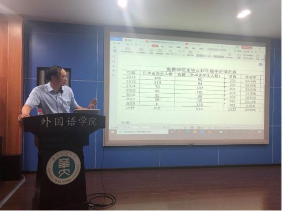 罗良功院长在接下来的讲话中首先表示我们一定响应学校和研究生院号召,将公费师范生教育硕士培养放到重中之重的地位。公费师范生教育硕士的培养是关系到学院学术学科声誉和学院文化建设的重要工作之一。近年来,学院也针对问题采取了一些行之有效的举措。如学院从2018年开始,利用公费师范生本科毕业离校前的时机,开设公费师范生教育硕士的先行课程,增加了公费师范生教育硕士的集体面授培训时间,效果显著。学院在公费师范生教育硕士课程建设上在2017年和2019年两次增加投入,建设了一批新的教学课程资源。在管理上更加精细化、规范化,毕业率有所提高。罗院长也对公费师范生教育硕士培养导师们提出了拓展自我领域、构建交流氛围、转换思想负担的期望,明确提出学院会将导师培训制度建设和学习机制建设工作常规化、常态化。